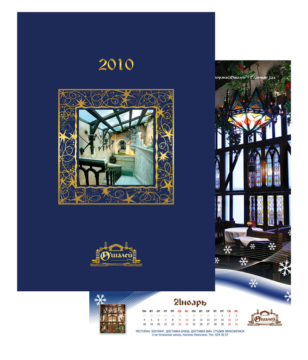 Календарь настенный на ригеле. Календарь А3 формата, обложка календаря из дизайнерской бумаги темно-синий металлик, тиснение золотой фольгой, вырубка. |